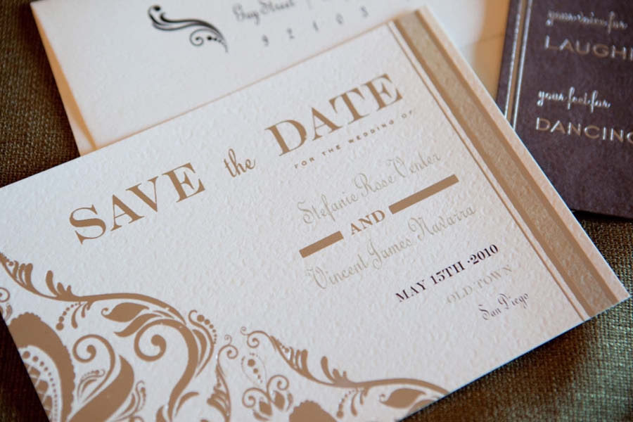 This gorgeous and opulent Save the Date features bold baroque silver foiling on thick cream colored textured card stock with a vertical belly band that reveals the wedding details to your guests. With the Belly Band on it reads “Save your memories for toasting, your voice for laughing, your feet for dancing”. When you remove the vertical belly band it reveals “Save the Date” with your wedding information.